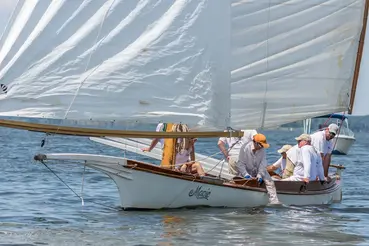Over time, the workboat evolved into a vessel designed purely for speed and spectacle. Most of the log canoes racing today are between 75 and 100 years old, with fewer than two dozen remaining. They are instantly recognizable by their narrow beams, oversized schooner rigs, and their daring crews. The enormous sail area makes the boats highly unstable — prone to capsizing without the skillful teamwork of the sailors who act as human ballast. Perched on 15-foot springboards extending from the hull, these sailors shift from side to side with every tack, their movements a graceful, synchronized dance against wind and water. Watching them traverse the boards is a remarkable display of strength, balance, and timing.
